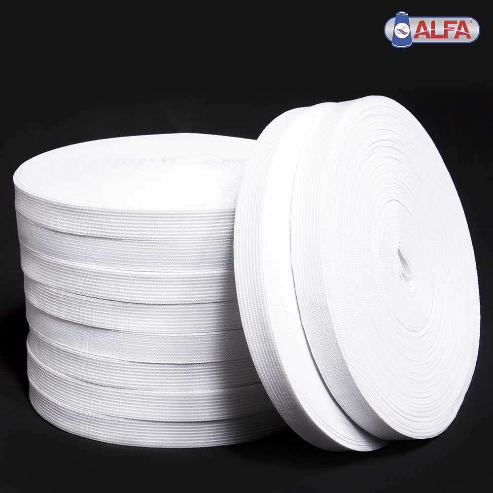 ELÁSTICO DE EMBUTIR 70% POLIÉSTER 30% ELASTODIENO, COM 15MM DE LARGURA, SÃO PRODUZIDOS COM FIO BRANCO E PRETO, NO TEAR CROCHÊ, E SÃO EMBALADOS EM ROLOS COM 25 METROS. O ELÁSTICO ALFA É EXTREMAMENTE VERSÁTIL, COM ÓTIMA RESISTÊNCIA E BOA ELASTICIDADE. É UTILIZADO EM, ARTIGOS DE BELEZA, ITENS PARA TREINAMENTO FUNCIONAL, PEÇAS DE ROUPA, ALÇAS DE SACOLAS E BOLSAS, BONÉS, CAMA, MESA E BANHO, ENTRE OUTROS.